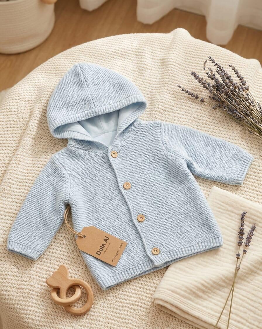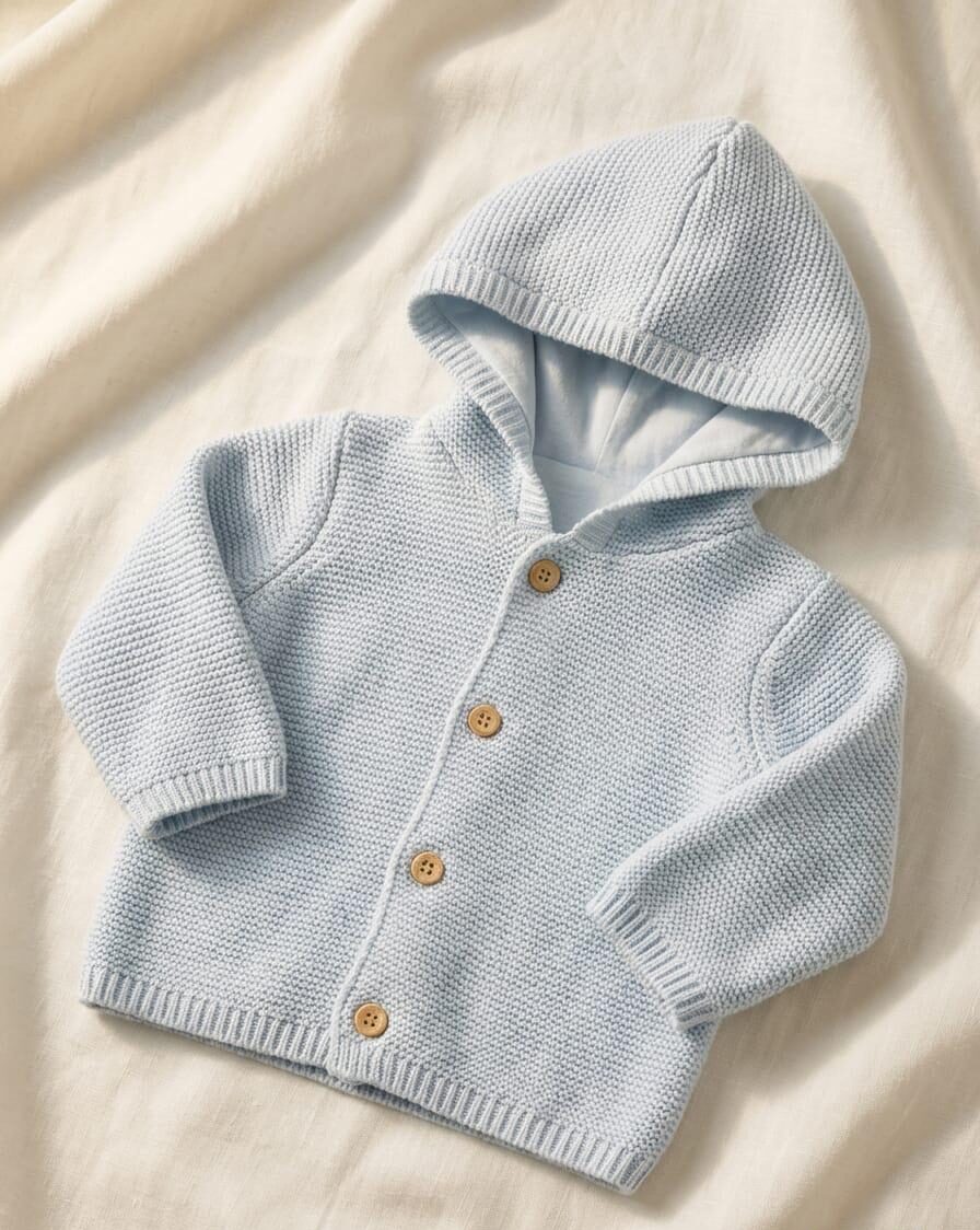 This charming baby cardigan is crafted from a soft, mid-weight knit, making it an ideal layering piece for transitional weather. It features a distinct garter-stitch texture that provides both warmth and a slight stretch for active little ones.